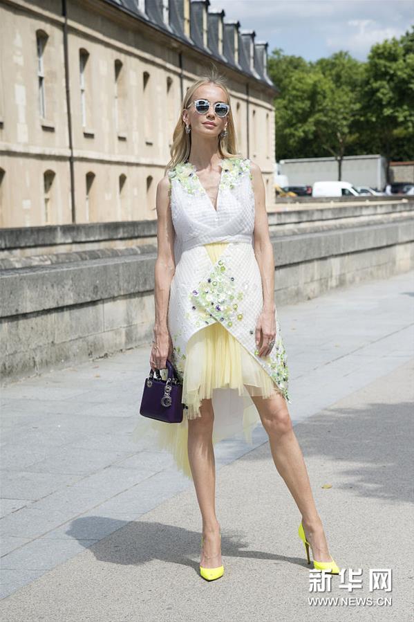 俄罗斯名媛Tatiana Korsakova时尚街拍。她戴镜面墨镜,身穿Delpozo立体花朵刺绣拼接百褶薄纱无袖前短后长连衣裙,脚踩 Duccio Venturi黄色尖头高跟鞋,手拿Dior Lady深紫色手提包。(图片来源:视觉中国)