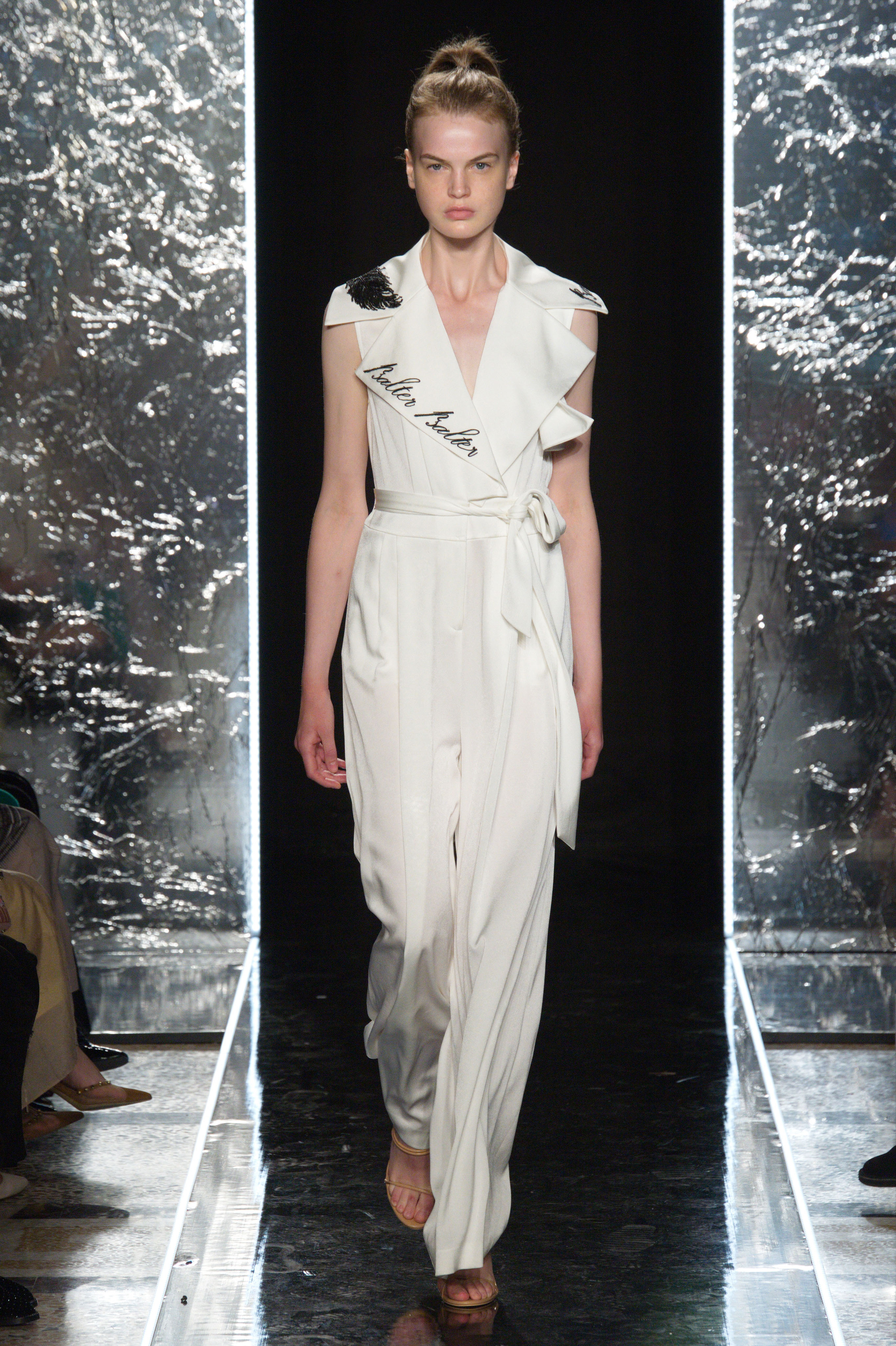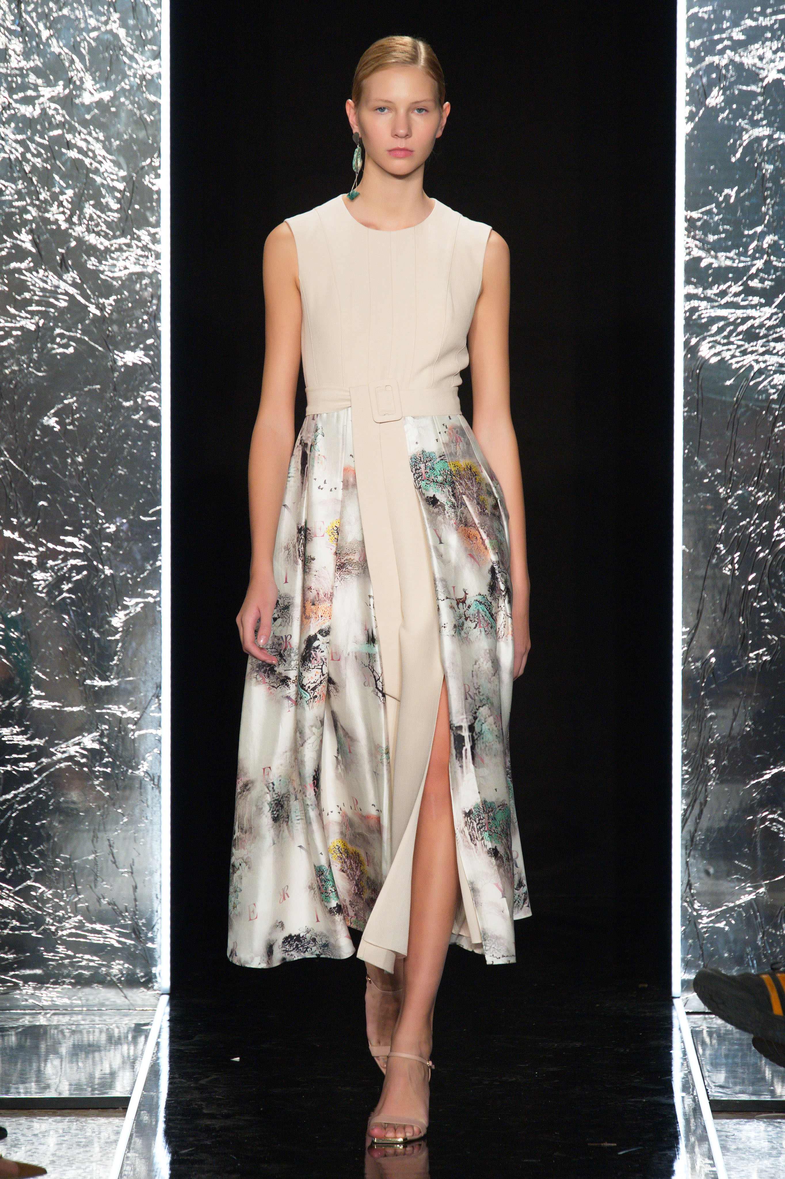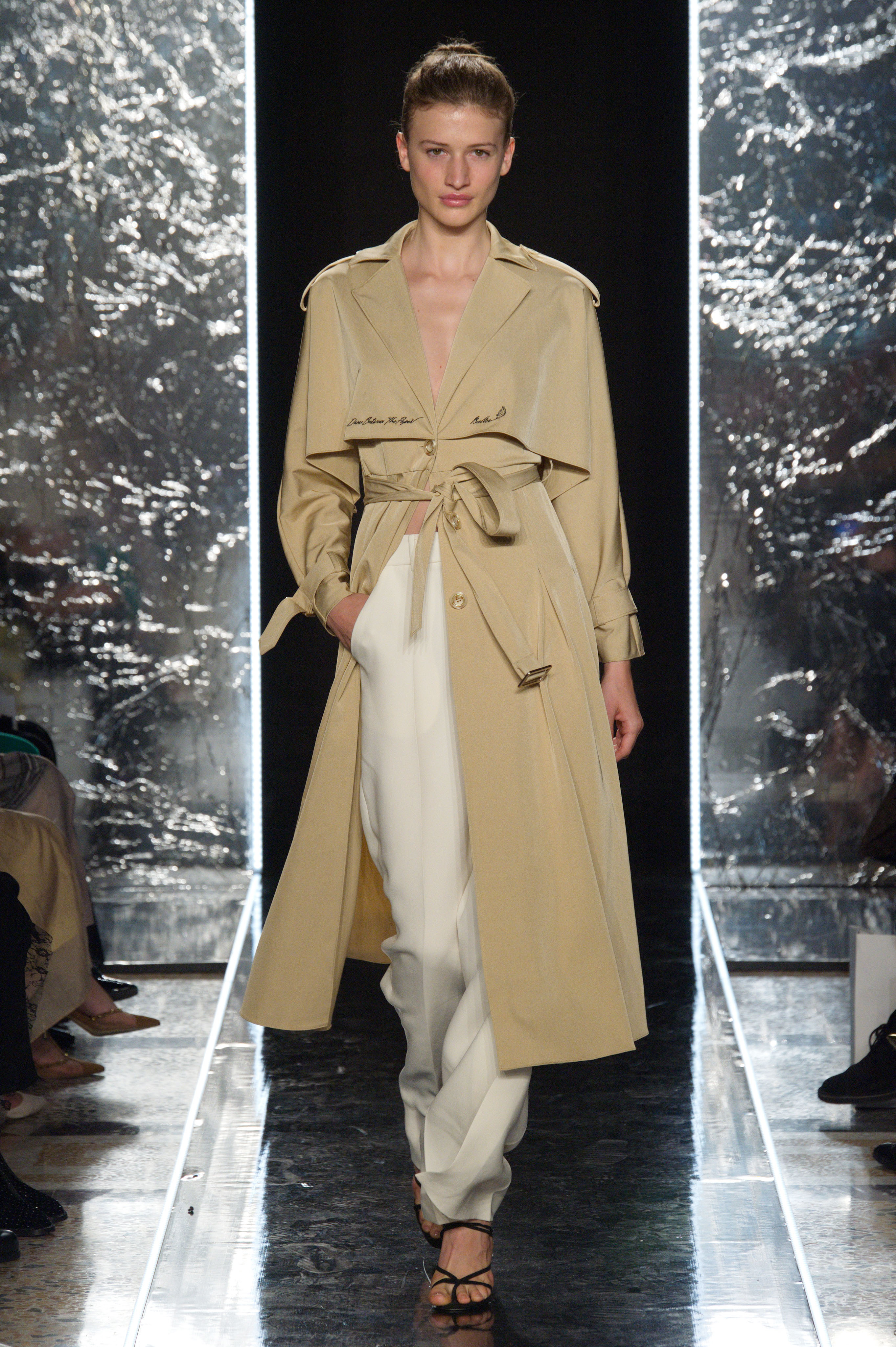 金色的光芒,从四面而来,作为“光之声”主题的主要意向贯穿整个发布系列。融入金属丝线、金色贴片、金色串珠、金属花朵的再造面料,以闪烁的奢华,呈现金色光泽;立体压褶、流畅的长线条廓形等如光束照下来,充满流动感。其间穿插的一点点肉粉及花朵元素,表达春天的温软感,也给整个系列更添几分女性韵味。