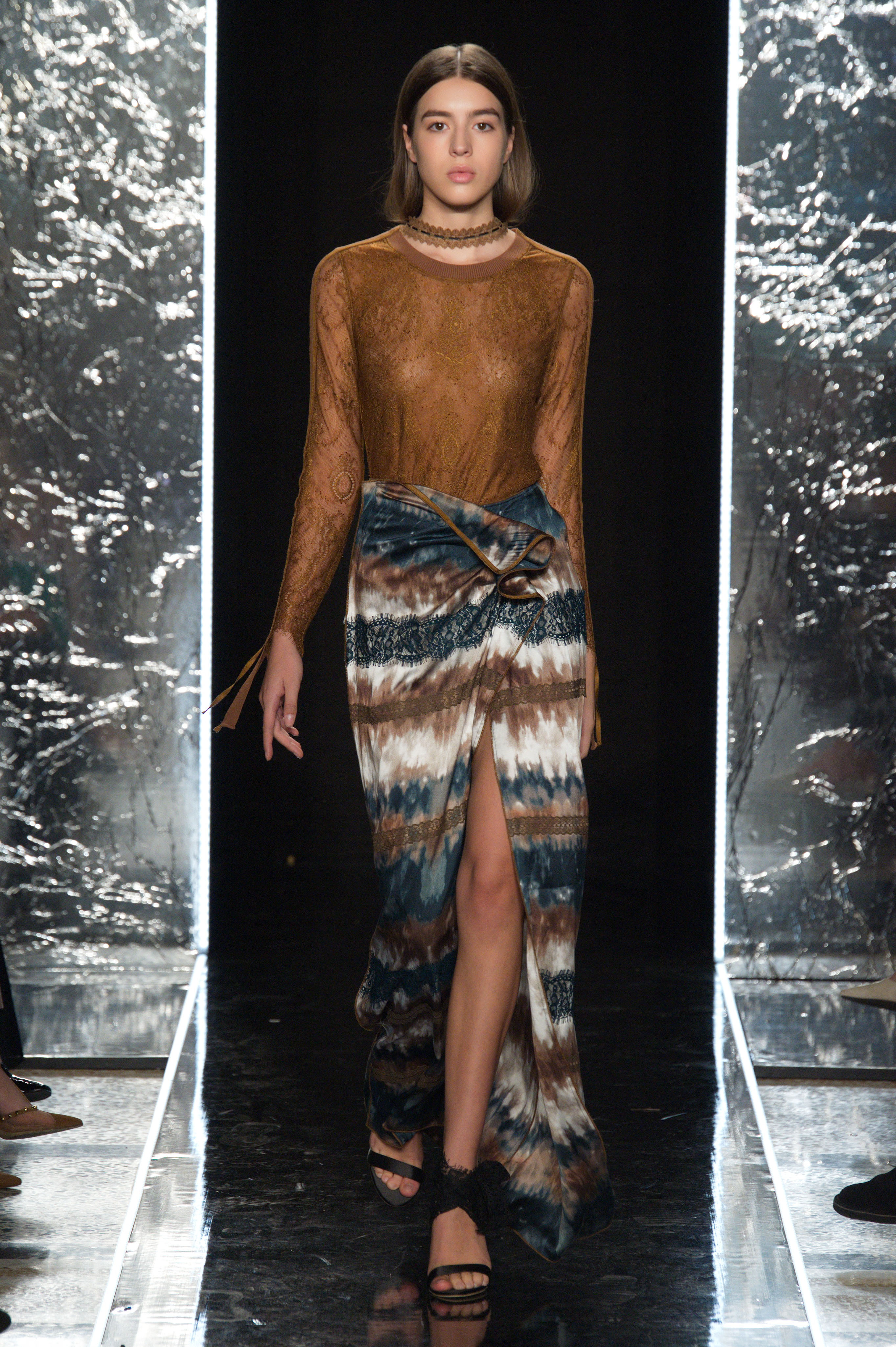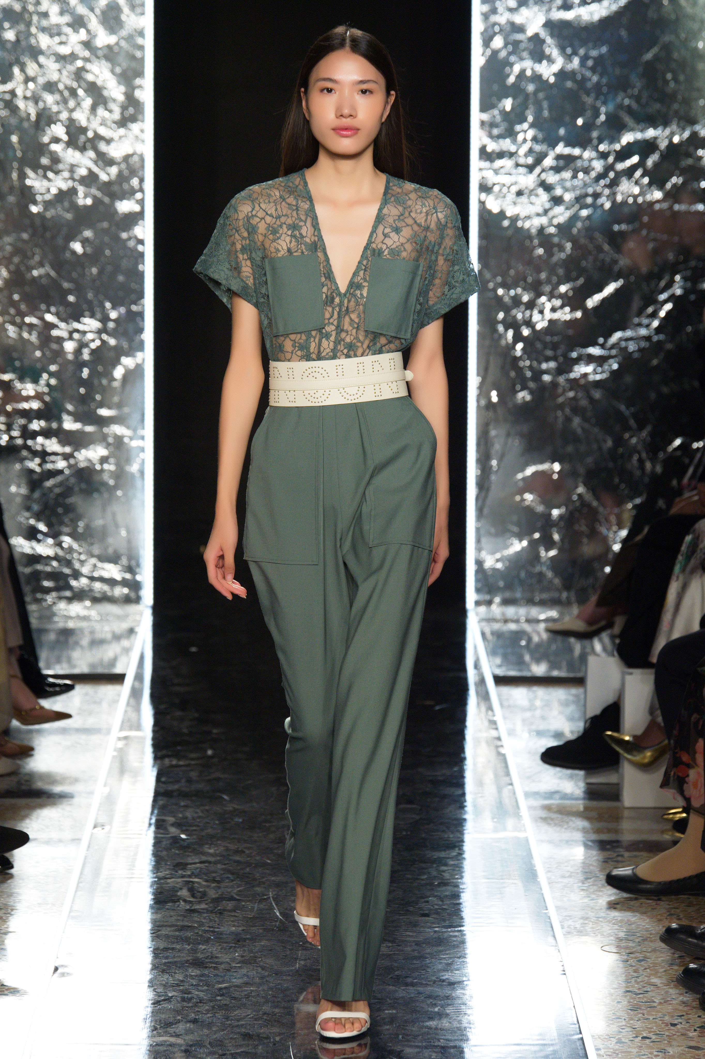 本届秀场上,INSUN恩裳“打破常规”,放大“柔度”从全新视角来进行诠释。在西装面料上巧妙地局部拼接蕾丝,带来质感的对比和碰撞,增加了款式的透视感,以及视觉效果的华丽感;用色在延续品牌色——黑白灰的基础上,融入2020春夏最流行的浅驼色和牛油果绿,增添柔软气息;从一片式结构衍生而来的立裁褶皱、不对称剪裁、精细压褶与局部的挖减镂空等手法,延伸品牌设计一贯的建筑感,用一种后现代美学的建筑手法来展示女性曲线。