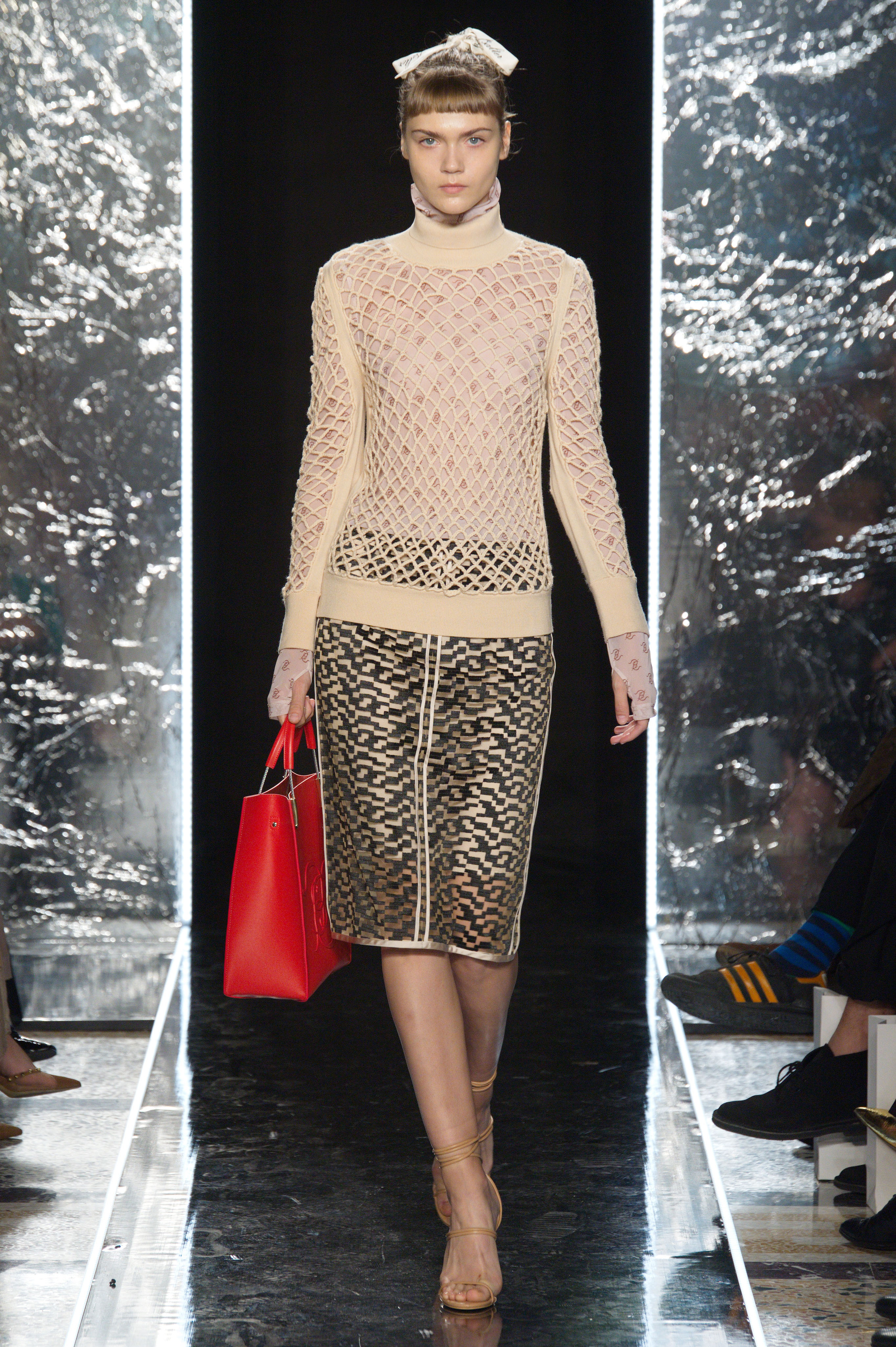 商务套装系列,本次大秀也有许多偏柔性的改动。比如白色蕾丝的商务套装,加入了泡泡袖的设计;配饰上也多运用到蕾丝面料,品牌slogan被运用于绑带等;搭配上,通过超大落差的层叠穿搭凸显新锐的时尚姿态。