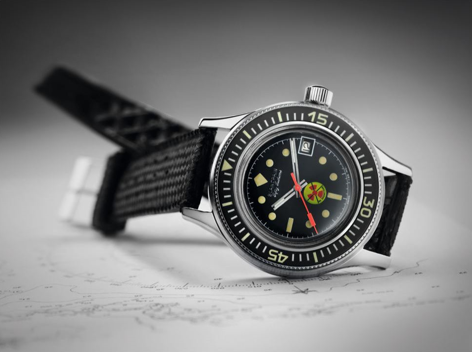 电影中的五十噚腕表有处十分打眼的设计——表盘六点位的无辐射标识,一个带有原子符号、斜线和“ NO RADIATIONS”字样的黄圈。当时很多市面上的其他潜水表为了夜间读数清晰,采用了在黑暗中也很亮泽的“镭”等材质制作时标、指针。然而这类型的放射性物质对人体有害,所以宝珀在最初所有五十噚腕表上,都使用了无放射性的氚材料,以使其在黑暗环境中也能维持剔透光亮,且无害。影片中这款二十世纪六十年代的五十噚复古腕表的无辐射标识从设计上也彰显了这一特色。