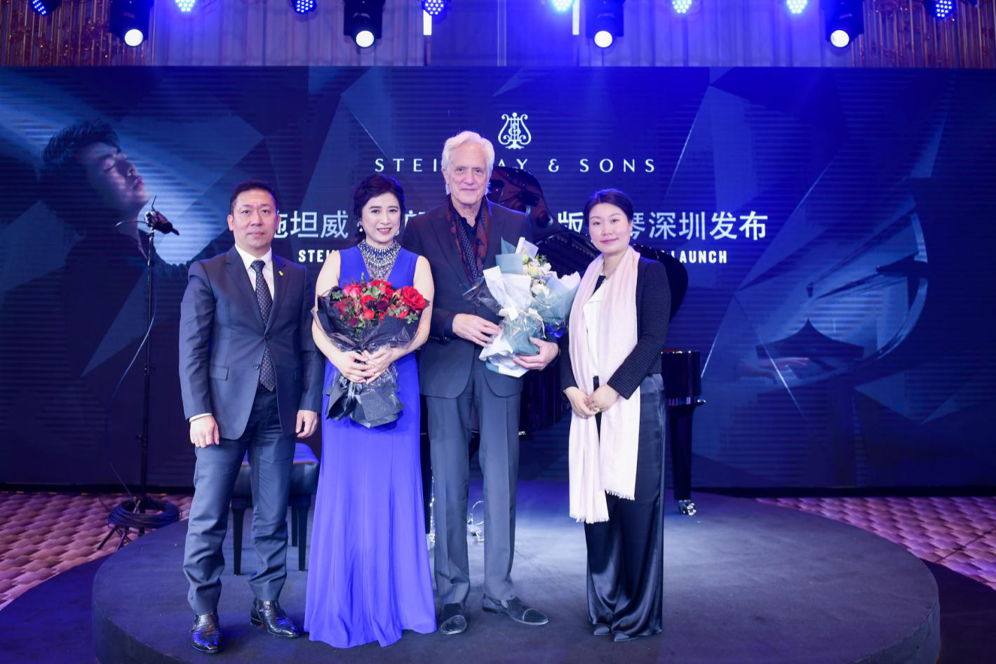 施坦威·郎朗黑钻限量版钢琴深圳新闻发布会活动嘉宾合影左起:和乐文化传播有限公司董事长翁寰、施坦威艺术家郑慧、美国著名设计师达科塔·杰克逊(Dakota Jackson)、施坦威亚太区总裁位炜合影
