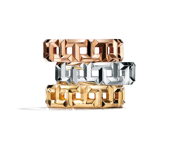 Tiffany T系列是蒂芙尼的风格之作,极具摩登色彩的 Tiffany T系列以风格强劲、极具图形感的字母 T为原型,蒂芙尼通过将其重新构想、打造成具有建筑风格的手链及戒指,全新呈现 Tiffany T True系列珠宝,以18K白金、黄金、玫瑰金打造“T”形图案交织相扣的摩登造型,寓意交融、相连的 TA与 TA,颂扬每一段独一无二的爱情。(吴艳)