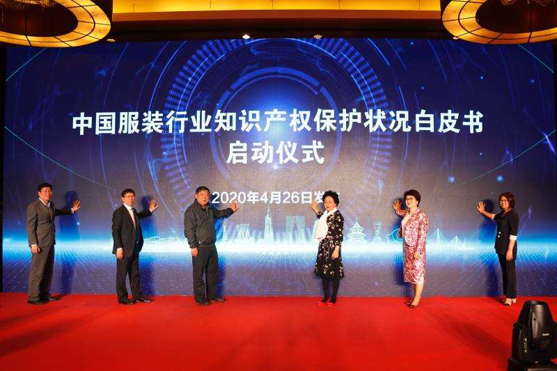 ▲中国服装行业知识产权保护状况白皮书启动仪式(台上嘉宾从左至右)中国知识产权法学研究会副会长金克胜、中国服装协会副秘书长赵雅彬、北京知识产权司法保护研究会会长王明达、深圳市服装行业协会会长沈永芳、深圳市知识产权联合会常务副会长王跃、影儿时尚集团副总裁贺萍