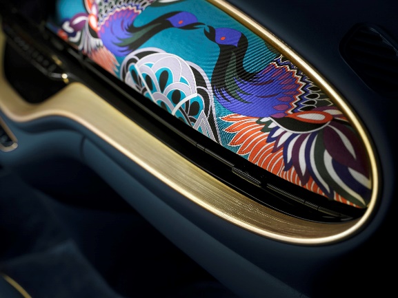 这款珠宝车型拥有专属的B.500标识,正中心为宝格丽八芒星图案,密镶闪亮钻石。方向盘以密镶钻石的宝格丽品牌标识点缀,镶嵌紫水晶、黄水晶和托帕石,呈现花团锦簇般的视觉美感。密镶钻石的宝格丽品牌标识还可拆卸,作为胸针佩戴。