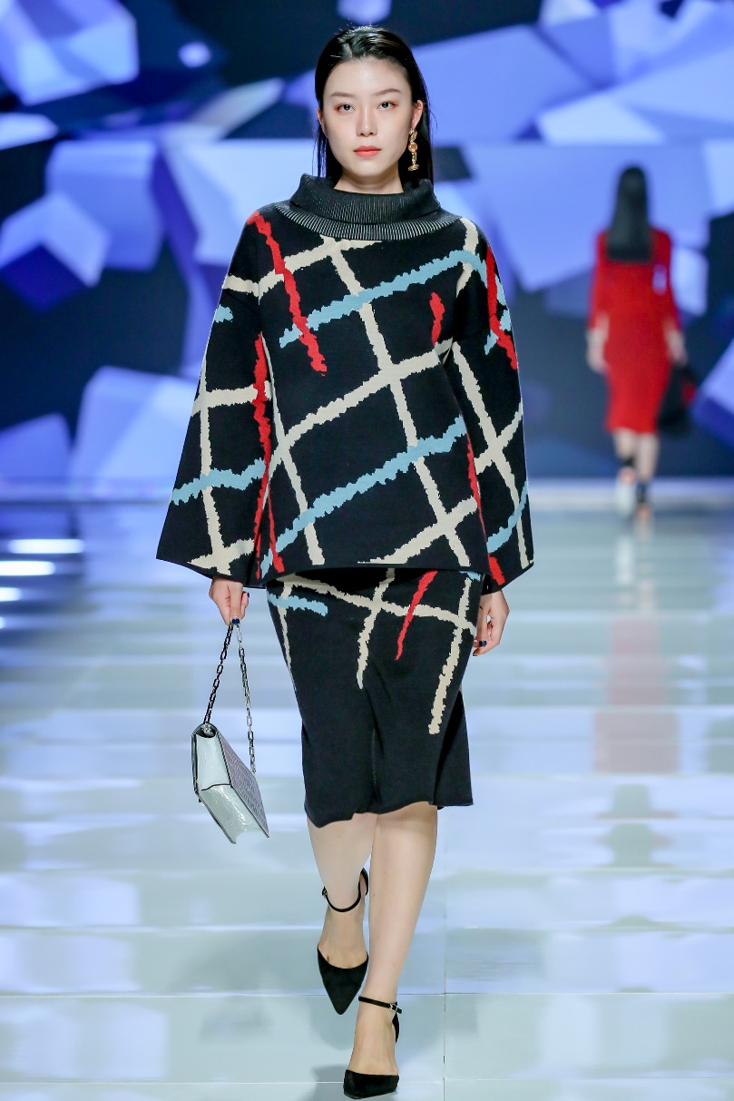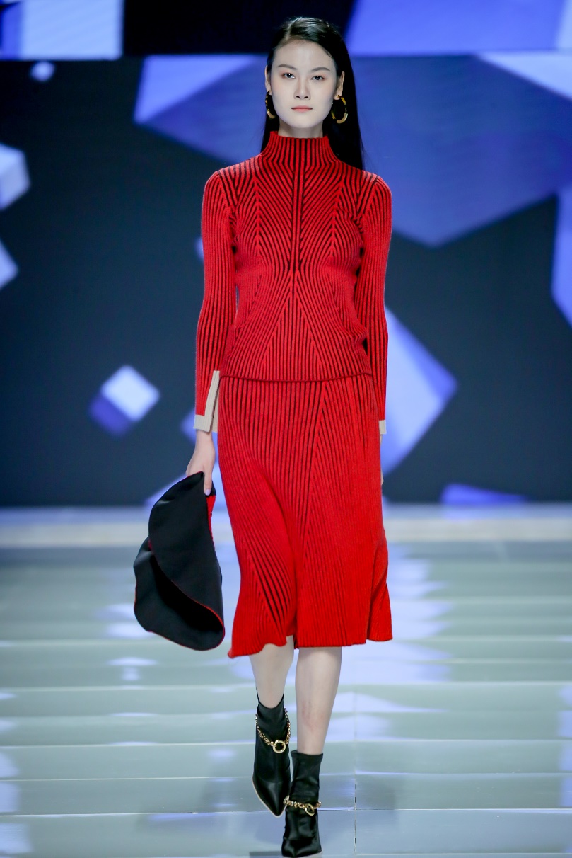纵横交错的线形图案在柔软的针织面料上绽放,一针一线织就极富立体感的修身廓形。迎面走来的摩登女郎展示的是刘彦君与音儿合作的针织系列。被誉为针织工程艺术家的刘彦君在此次合作中以神秘、女性化、摩登为关键词,以软雕塑定义针织,用一根线的千变万化营造出都市女魔头的时尚衣橱。
