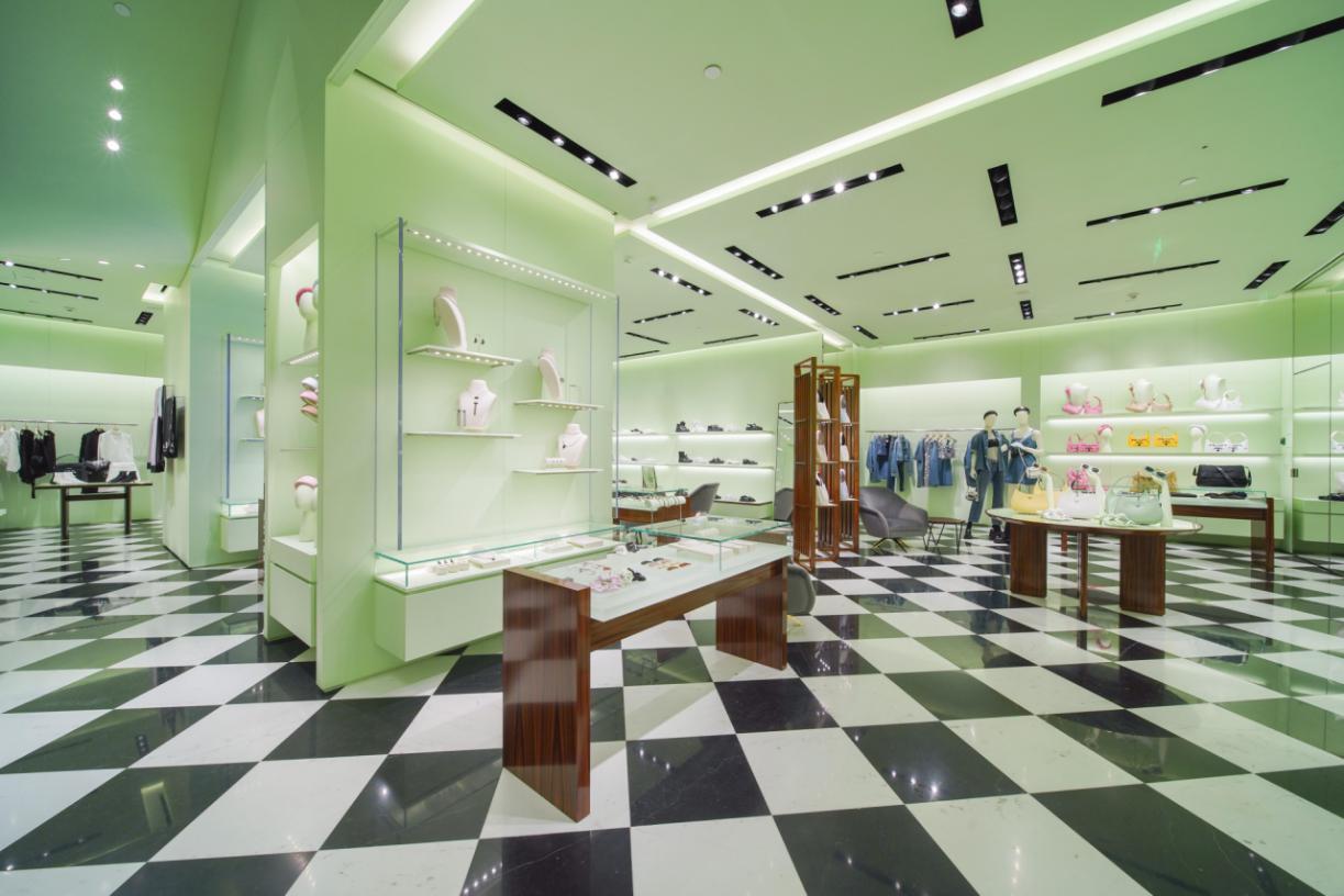 女装区集合了品牌诸多标志性元素,其中黑白方格大理石地板源于Prada米兰伊曼纽尔二世长廊精品店(Galleria Vittorio Emanuele);店铺经典绿色则包覆展柜,上嵌水晶玻璃细节。