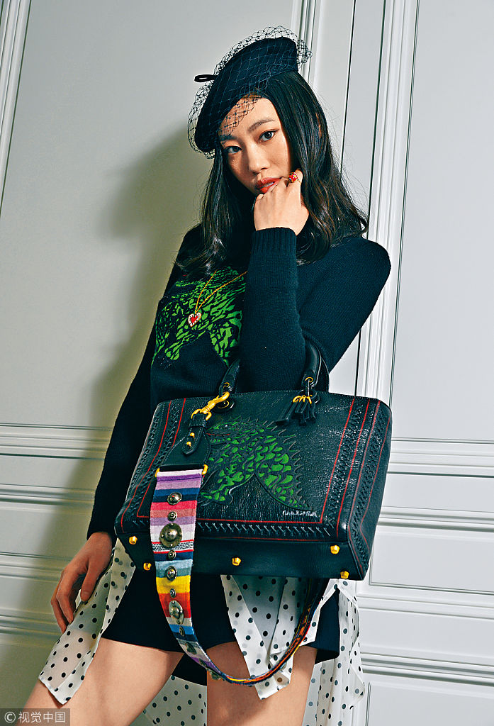 大号软山羊皮Lady Dior手袋,袋面饰以Laser Cut镂空神龙图案,并配以古铜制窝钉缀饰彩色肩带。(图片来源:视觉中国)