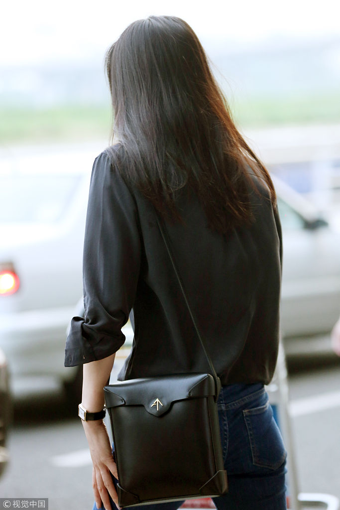 2016年07月28日,北京,刘雯现身机场。她戴黑框眼镜,身穿黑色深V衬衫,肩背Manu Atelier黑色皮质手袋,下穿深蓝色破洞毛边喇叭牛仔裤,脚踩黑色绑带平底鞋。 刘雯
