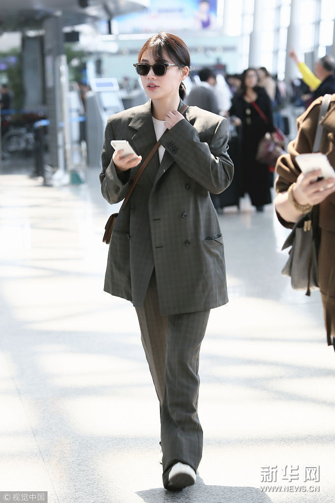 湖南长沙,近日,马思纯现身长沙黄花机场,纯灰西服现身,黑超加持攻气足