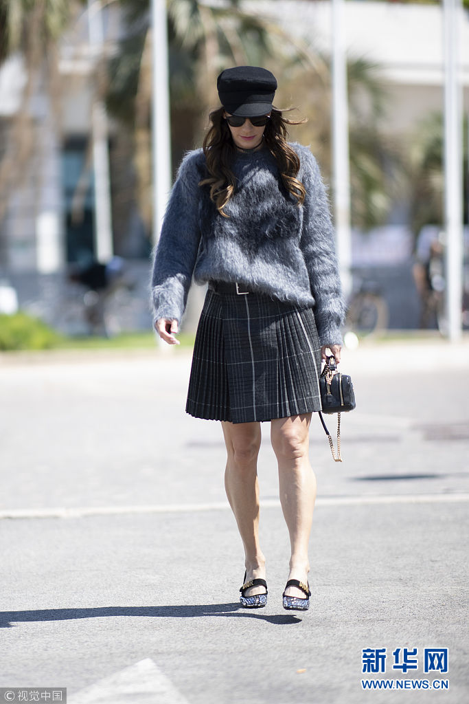 当地时间2018年5月15日,法国戛纳,Timea Vajna街拍。发型:长发,卷发,棕发上装:毛衣,马海毛,印花,灰色下装:短裙,百褶裙,格纹,深灰色鞋。(图片来源:视觉中国)