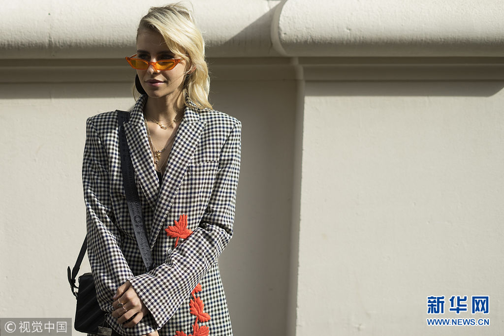 当地时间2017年9月29日,法国巴黎,2018春夏巴黎时装周:潮人街拍(9月29日)。橙色,窄墨镜,小墨镜,猫型墨镜,不对称,黑白,黑白格,格纹,格子西装,西装,外套,宽肩,刺绣,黑色,单肩包。(图片来源:视觉中国)