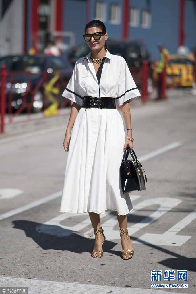 2016年9月15日讯,美国纽约,当地时间9月14日,(第七天)2017春夏纽约时装周:街头潮人。金色,墨镜,链条,choker,白色,衬衣裙,腰封,绑带,束身腰封,漆皮,裙装,连衣裙,白色,长裙,黑色,手提包,包,漆皮包,金色,叶子,系带,凉鞋,高跟鞋,女鞋,鞋子。(图片来源:视觉中国)