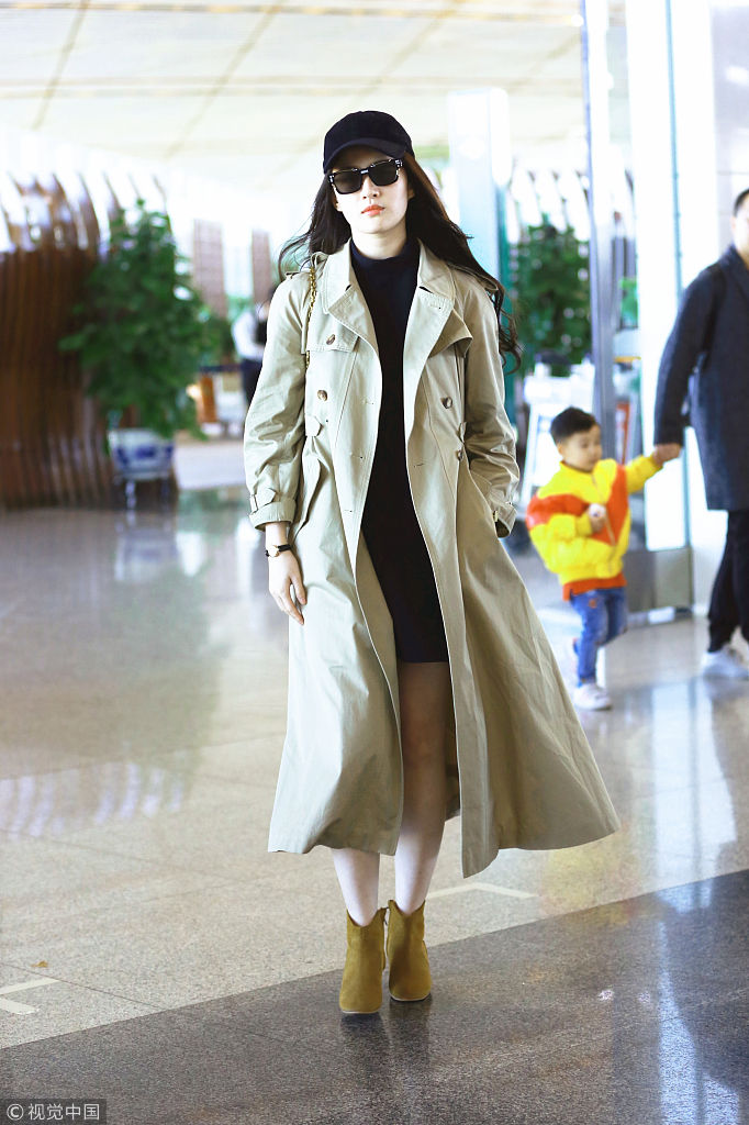 刘亦菲出发时装周。她戴Dior J'ADIOR黑色墨镜,黑色鸭舌帽,身穿Dior 2017春夏系列卡其色双排扣风衣,内搭Dior 2017春夏系列黑色连身裙,肩背Dior J'ADIOR黑色链条包,脚踩棕黄色麂皮粗跟踝靴。