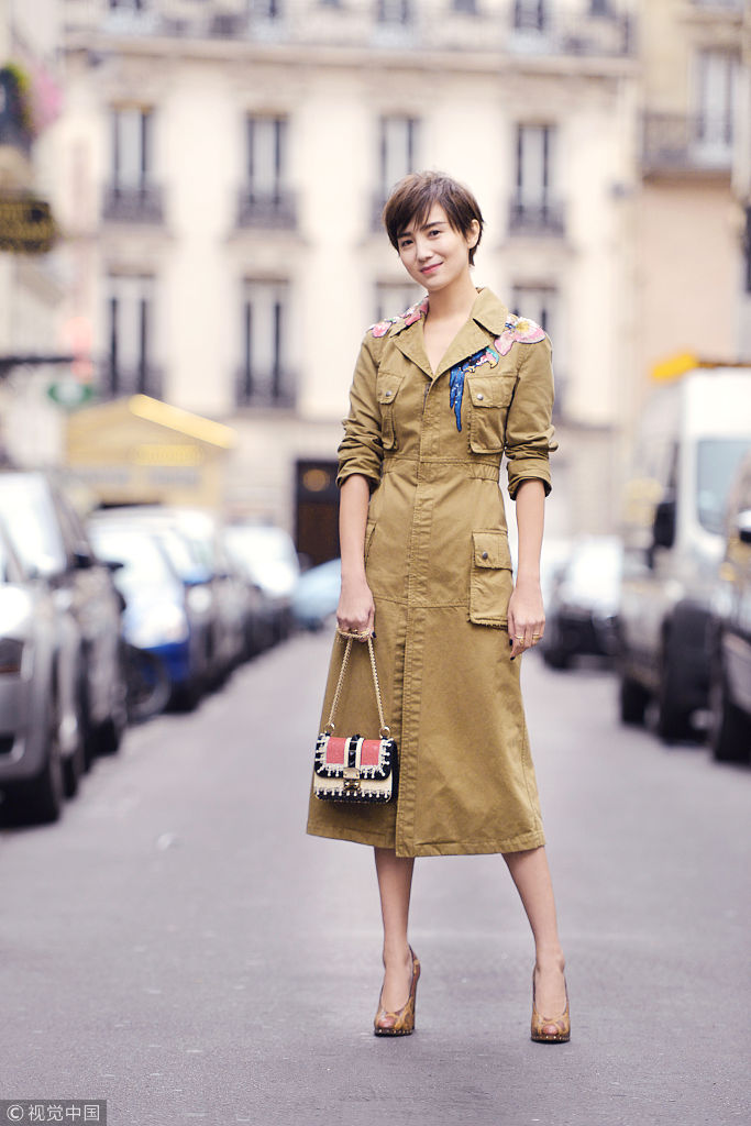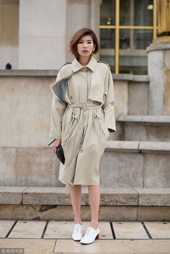 小宋佳亮相2017巴黎时装周Valentino2017春夏系列女装秀,穿驼色风衣优雅时髦。