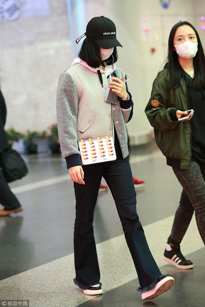 蒙面刘诗诗现身北京机场。她头戴黑色字母鸭舌帽,戴白色口罩,身穿拼色亮面夹克,内搭白色帽衫,Moschino金属色药丸包,下穿黑色毛边牛仔喇叭裤,脚踩白色厚底休闲鞋。