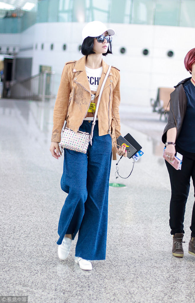 刘诗诗头戴白色鸭舌帽,黑色墨镜,身穿Tod's驼色印花麂皮机车夹克,内搭Moschino白色小熊字母印花T恤,肩背Tod's裸色彩色圆钉装饰手袋,下穿深蓝色毛边阔腿牛仔裤,脚踩白色皮鞋。