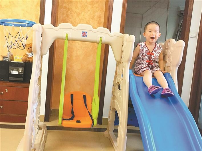 王女士小孩正在租来的滑梯上玩耍。