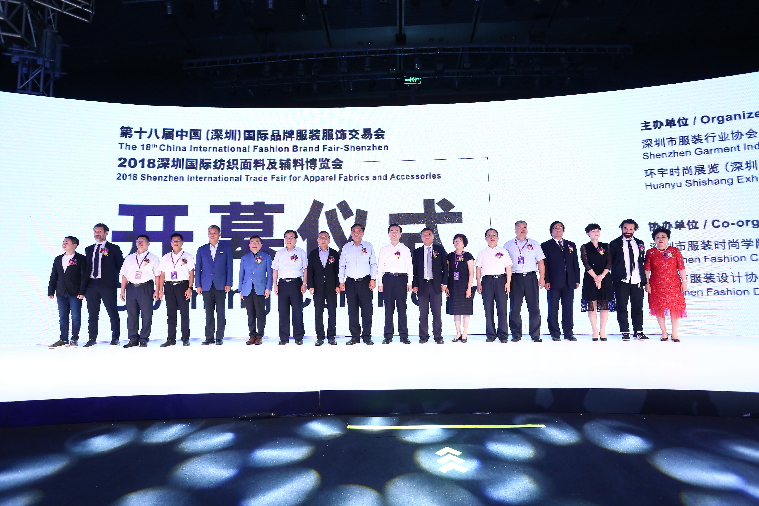 开幕仪式上,河北省人民政府副省长李谦,中国纺织工业联合会原会长王天凯,深圳市人民政府副市长、党组成员王立新,中国纺织工业联合会副会长、中国贸促会纺织分会常务副会长徐迎新,国家消费品工业司副司长曹学军,河北省人民政府副秘书长王素文,河北省工业和信息化厅厅长龚晓峰,深圳市委外宣办、深圳市设计之都推广办主任韩望喜,深圳市经济贸易和信息化委员会副主任胡晓清,深圳市龙华区政协副主席、大浪时尚小镇建设工作领导小组执行副组长仙新民,桐乡市副市长朱伟强,于都县委常委何新平,桐乡市崇福镇镇长计亚平,福建省商务厅处长曾金栋,深圳市服装行业协会会长沈永芳,欧洲设计学院IED亚洲业务部总监费德里克•卡文吉、意大利知名时尚设计师埃尼奥•卡帕萨、深圳市设计与艺术联盟秘书长刘振等领导嘉宾共同启幕,见证了2018时尚深圳展的盛大启航。