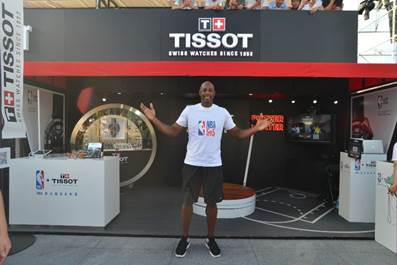 活动当天,最大的惊喜莫过于阿朗佐•莫宁的出现。这位前职业NBA球星曾荣膺过2006年NBA总冠军,是篮球历史上著名的铁血硬汉。现场他也出现在天梭腕表展台参观精美腕表产品,并在5v5比赛结束后为球员们合影、颁发天梭时捷系列热火队特别款腕表作为奖品。