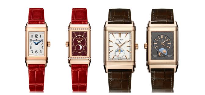 从左往右:积家Reverso One Duetto Moon月相双面翻转腕表玫瑰金款
