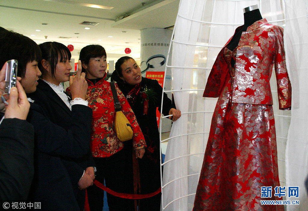 2007年11月16日 , 在安徽阜阳一家商场, 一款由铂金制成的婚纱吸引了人们的眼球。据介绍,这种镶有铂金的婚纱是由国际铂金协会特别订制,全球只有红色、白色和紫色三款。(图片来源:视觉中国)