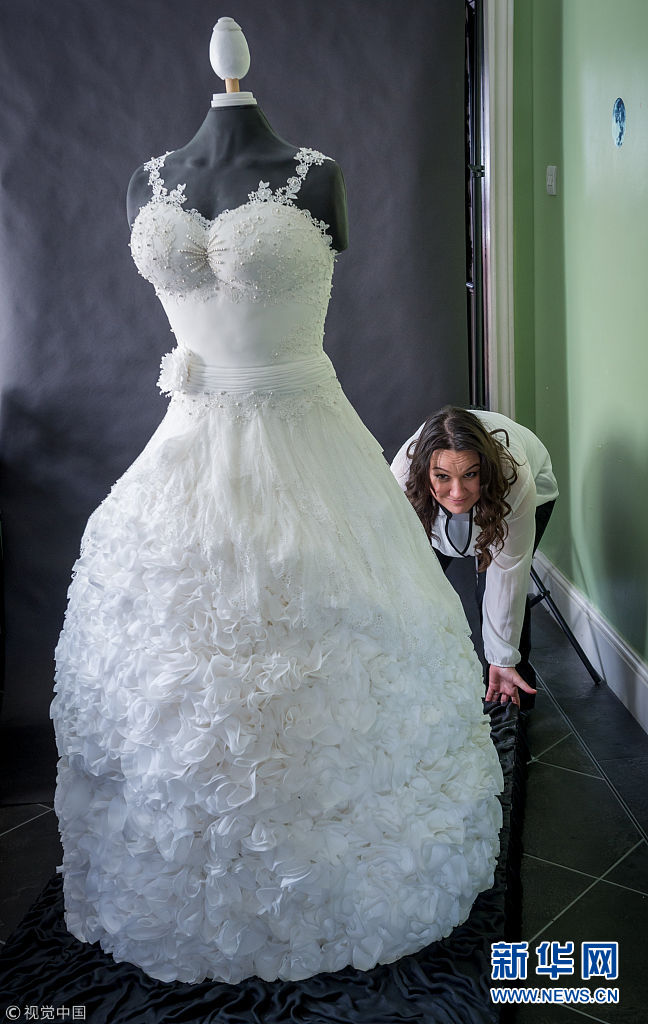 2016年4月11日讯(具体拍摄时间不详),真实尺寸大小的婚纱蛋糕。蛋糕重140斤,高1.7米。它由著名的蛋糕师Sylvia Elba设计,并由Elba、Yvette Marner、Ilinka Rnic三人整整用了300多个小时方才完成。 (图片来源:视觉中国)