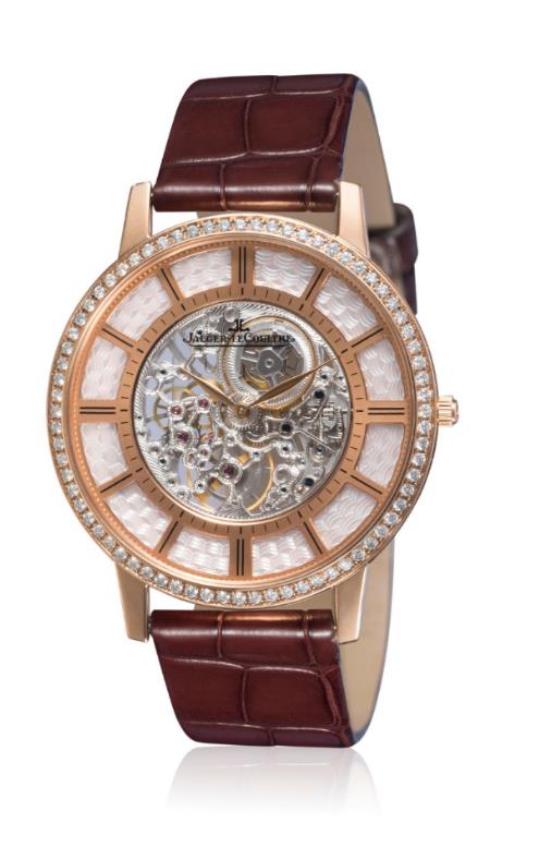 积家Master Ultra Thin Squelette超薄大师系列镂空腕表镶钻款明确地将璀璨光泽视为设计主线。以不同方式镌刻和装饰一系列不同的腕表部件熠熠生辉,每个时区皆装饰一片手工雕刻的天然珍珠母贝,质感精致细腻。积家拥有悠久的超薄腕表制作传统,其历史可追溯至1907年。大工坊选择将镂空工艺、雕刻工艺、珐琅工艺及珠宝镶嵌等超凡的手工技艺与超薄制表技术相互结合,极具创意。