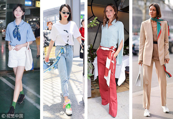丝巾是作为女性脖子上的物品,早在中世纪就开始用于抵御寒冷的衣物,但是随着时尚的演绎,丝巾早已经成为了女性必备的服装配饰之一。从而街拍中有着无数的的丝巾系法,丝巾已不再是保暖这么简单,更多的另一种时尚!(图片来源:视觉中国)