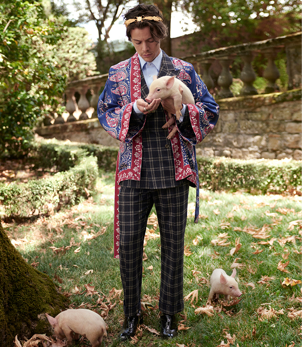 身处16世纪文艺复兴时期风格主义的意大利别墅花园,哈里·斯泰尔斯穿上全新都会男士正装系列,当中独特的图案、彩色提花、嵌花编织、贴饰,配合别具一格的裁剪比例,将古驰的当代美学展现得淋漓尽致。