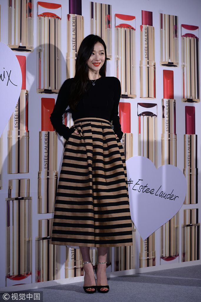 2017年4月5日讯,韩国首尔,5日,雪莉出席某美妆品牌活动。身穿黑色修身紧身针织衫,下穿棕色黑色横条纹蓬蓬裙,脚穿麂皮金色一字带鱼嘴细跟高跟鞋。