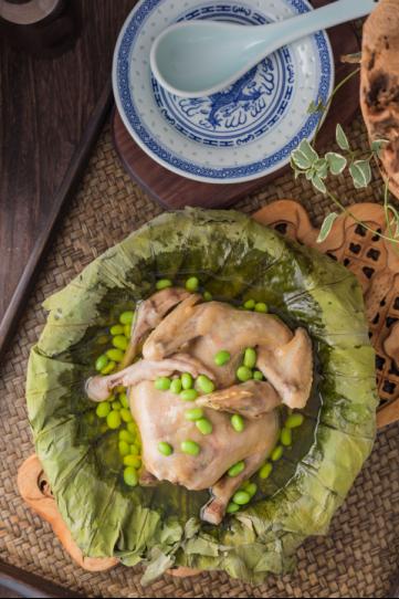 “池塘十里尽荷塘,姊妹朝来采摘忙,不摘荷花摘荷叶,饭包荷叶比花香。”清末民初的这首词,表明了人们对用荷叶制肴的喜好。选用肉质细嫩的仔鸡,以荷叶包裹蒸熟,松软适口,呈现原汁原味的鲜美,融合荷叶的幽幽清香,细细品味,仿佛回到梦里水乡。