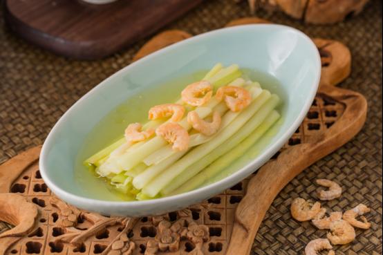 应季时令菜,茭白是江南三大名菜之一,有水中人参的美称,营养丰富,味道朴实,调入用湖虾虾籽熬成的虾酱冰镇,鲜香嫩爽。