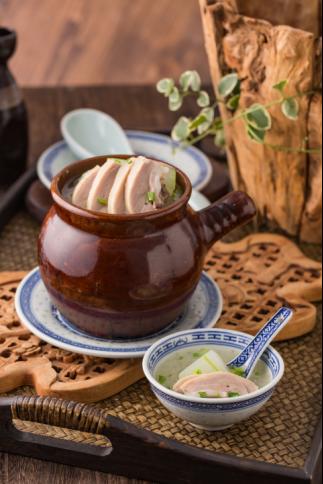 鸭是暑天的清补佳品,健脾化湿,冬瓜性寒味甘,清热生津。板鸭与冬瓜加入小香葱煨汤,慢火细炖出,冬瓜软烂,板鸭酥香,汤味清鲜,是一道僻暑除烦的夏日美味。