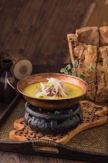 食材多来自水泽,藕带、菱角、茭白、蚕豆瓣、大虾仁,自制虾酱爆炒起香,时蔬的白绿点缀虾仁的淡粉,如青荷托芙蓉之色,砂锅盛上,滋滋作响,让人眼前浮现出“蛙声喧夏夜,鱼影动荷塘”的画面。