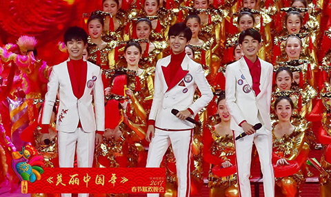 除夕之夜,以“大美中国梦 金鸡报春来”为主题的鸡年春晚如约而至。以“欢乐颂五美”与TFBOYS共同奉献的《美丽中国年》开场,以李谷一、关牧村、高音、刘雨欣等新老艺人演唱《难忘今宵》结尾,全程42个节目亮相春晚舞台,为除夕年夜饭捧上一道文化大餐,也为农历鸡年开了一个好头。