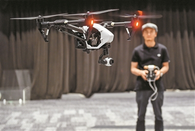 在深圳大疆创新科技公司,公司掌门人汪滔操控飞行器“悟”飞行。新华社 发