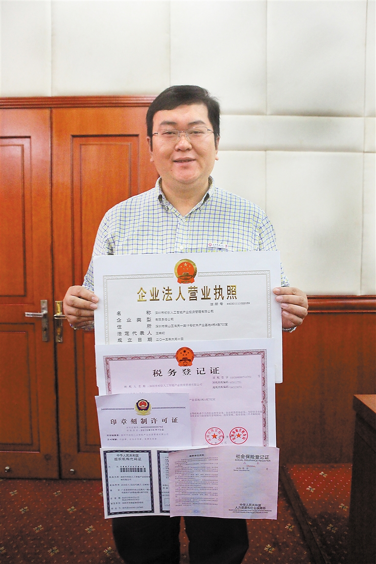 2015年,深圳市初创人工智能产业投资管理公司作为第一家企业一次性领到五张证照。(资料图片)