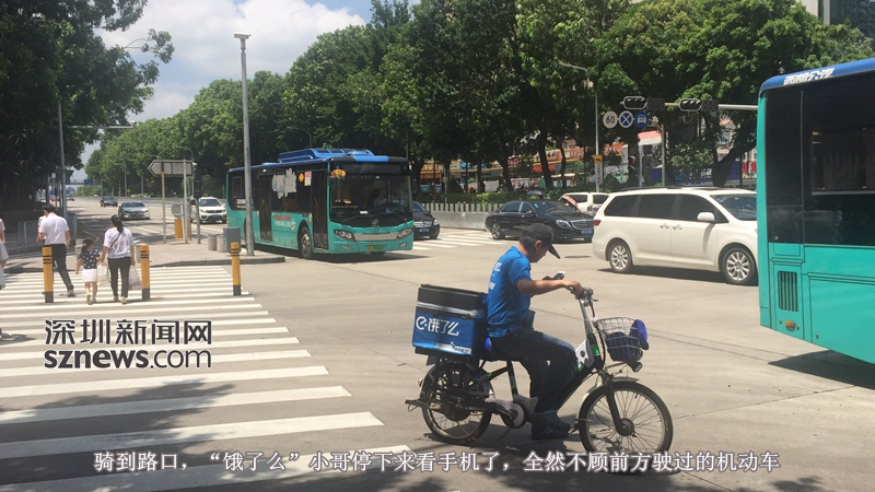 记者发现,外卖小哥们过马路时”驶上机动车道”、”闯红灯”、”逆行”、”停在马路中间打电话”、”看手机”的情况时有发生。
