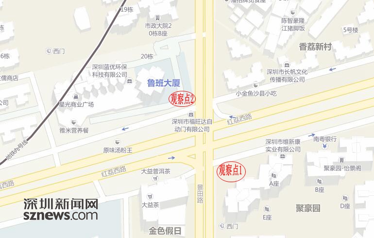 红荔西路和景田路所在片区以居民住宅区为主,写字楼较少,餐饮店集中在临街道路、商住楼、香梅市场、景田综合市场等地。记者选择的观察“据点”有两个,分别是红荔西路以南聚豪园门口和红荔西路以北鲁班大厦前。