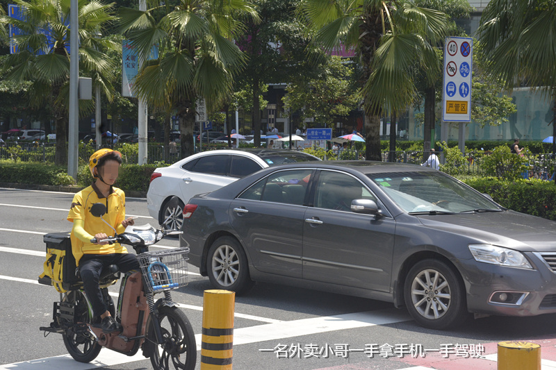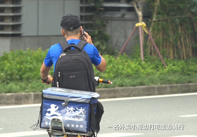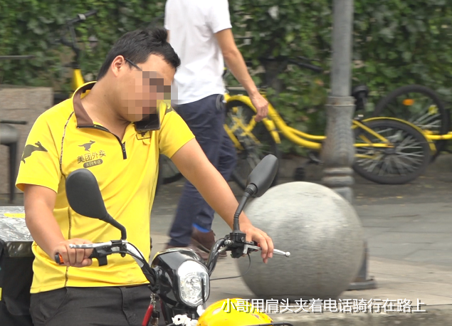不仅如此,还有的小哥左手点按着手机,低着头看屏幕,右手搭在方向盘上向前行驶;也有的是将手机夹在肩头,边打着电话边骑着车……