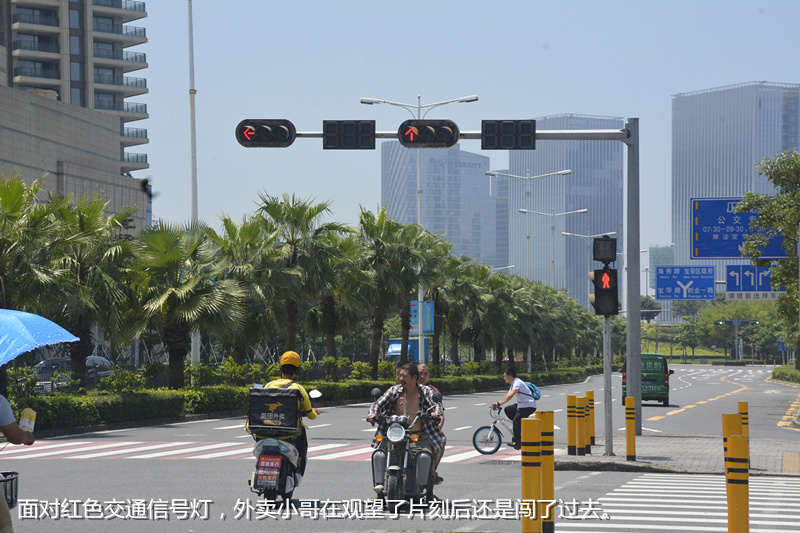 当记者站在十字路口的街角观测时,一辆黄色外卖餐车疾驰而过,送餐小哥左手举着电话,右手搭在电动车上,嘴里大喊“是这一栋吗?”,车尾的送餐箱上标着“美团外卖”字样,接着他沿着恒生银行与家乐福之间的路段径直朝南驶过,红绿灯指示牌形同虚设。
