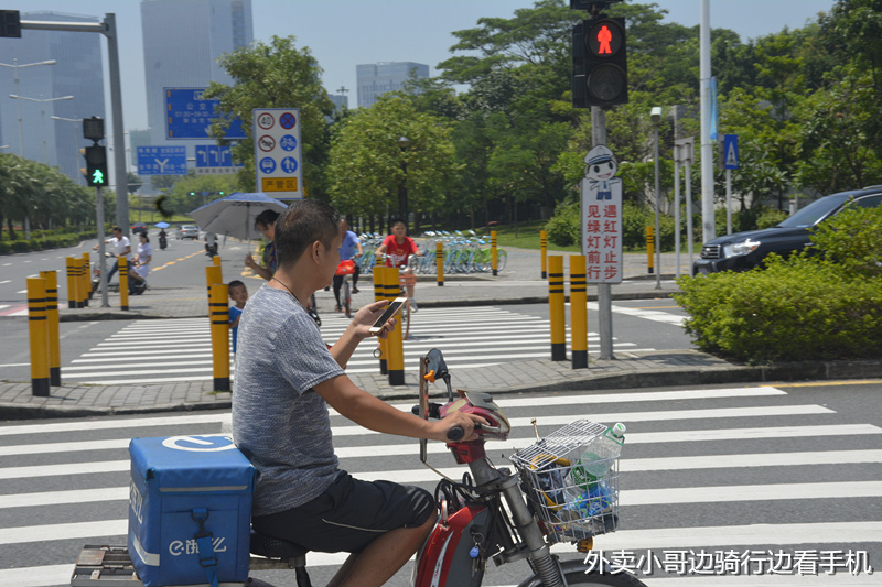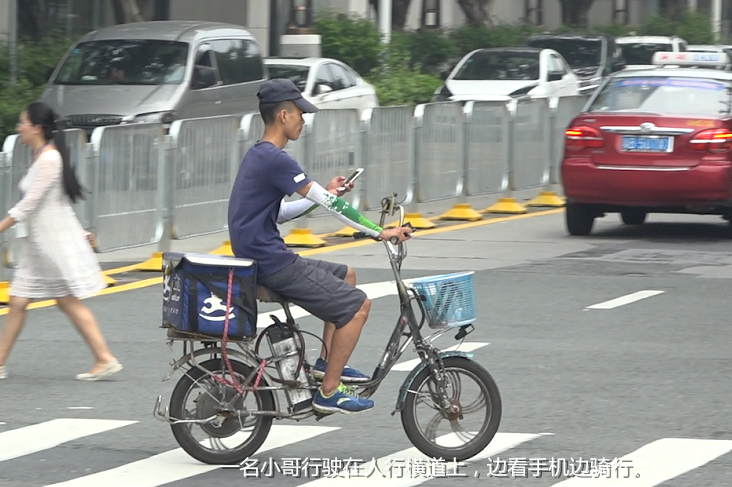 记者发现,外卖小哥们过马路时”驶上机动车道”、”闯红灯”、”逆行”、”停在马路中间打电话”、”看手机”的情况时有发生。