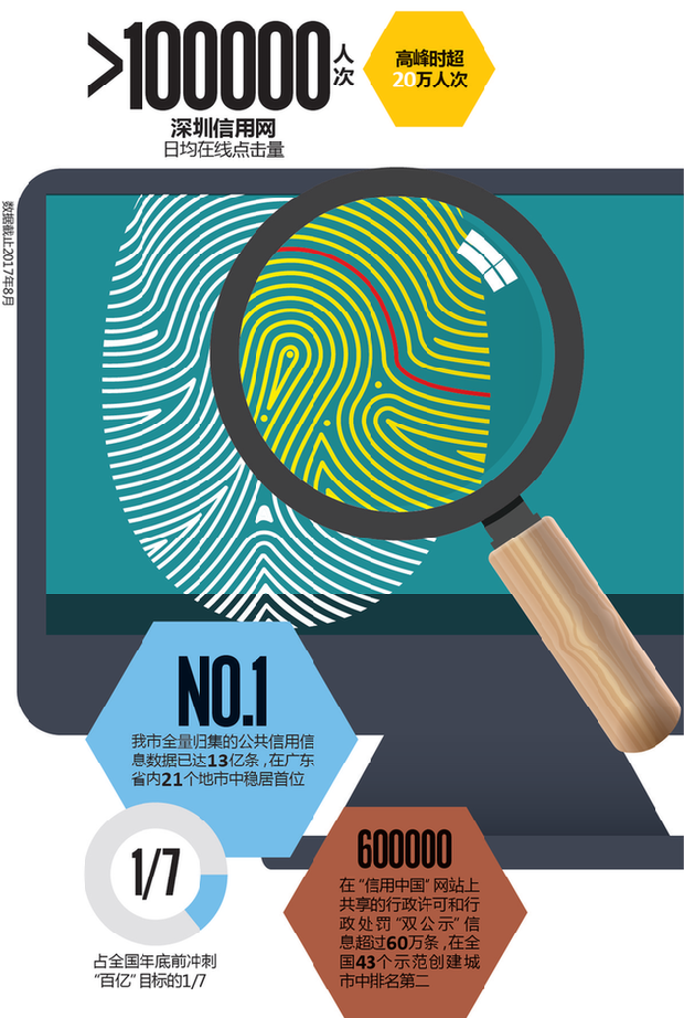 此外,深圳市初步建成统一、集约、高效的公共信用信息管理系统,该系统归集了来自52家市区单位提供的信息数据,涵盖了企业、社会组织、事业单位及重点人群的信用信息。截至目前,我市全量归集的公共信用信息数据已达13亿条,在广东省内21个地市中稳居首位,约占全国年底前冲刺“百亿”目标的1/7。同时,在“信用中国”网站上共享的行政许可和行政处罚“双公示”信息超过60万条,在全国43个示范创建城市中排名第二。