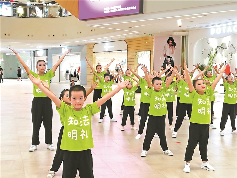 9月1日晚,在坪山益田假日世界商场一楼,30多个“法律小达人”出其不意的“快闪”舞蹈,吸引众多市民围观。活动现场,伴随着突然响起的欢快音乐,30多个统一穿着印有“法律小达人”、“知法明理”T恤的小朋友,突然出现在逛街的人群中,活泼、生动的“快闪”普法宣传服务活动精彩上演。