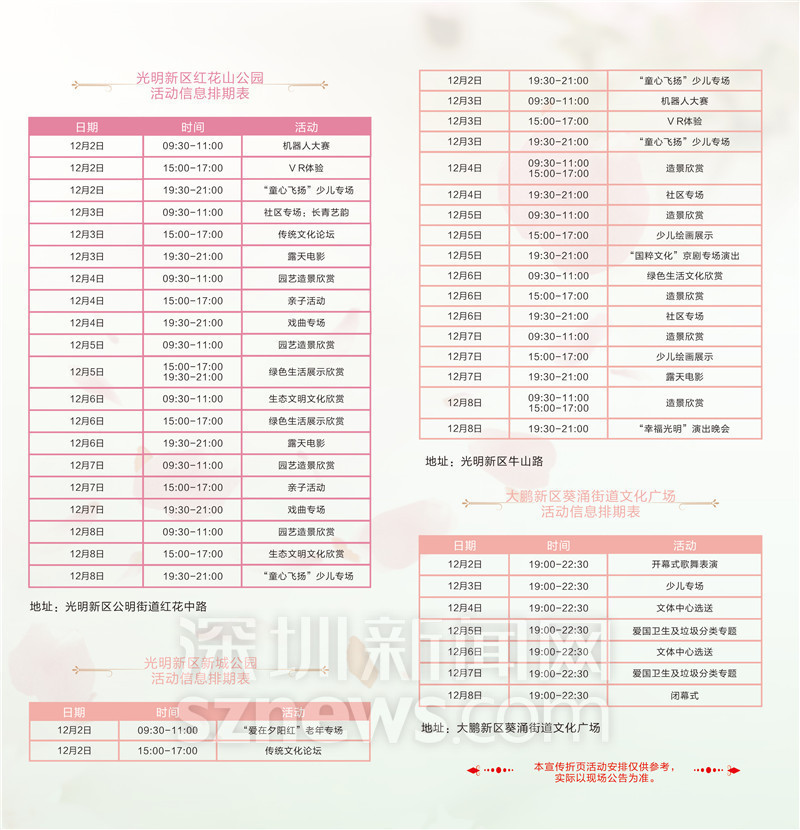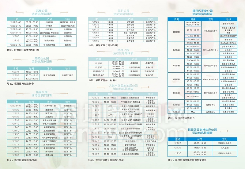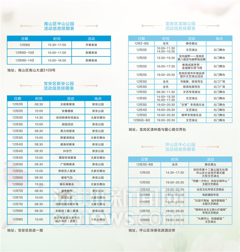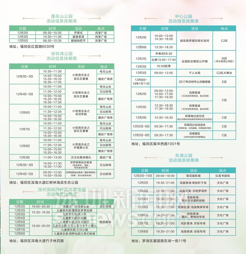 深圳新闻网12月1日讯(记者 钟鸿冰 通讯员 崔嵩)一年一度的公园文化节即将到来,12月2日-12月8日,2017年第十二届公园文化周将在全市27家公园举行。本届公园文化周紧密结合创建“国家森林城市”和打造“世界著名花城”重点工作,以“美丽深圳 多彩生活”为主题,充分展现美丽宜居的城市环境及丰富多彩的城市文化生活。