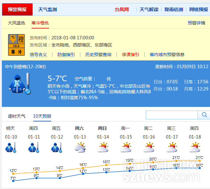 最低5℃ 深圳寒冷橙色预警生效 低温持续5天