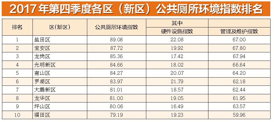 第四季度公共厕所环境指数测评结果显示,在全市10个区中,本季度公共厕所环境指数得分排名顺序为盐田区、宝安区、龙岗区、光明新区、南山区、罗湖区、大鹏新区、龙华区、坪山区、福田区。