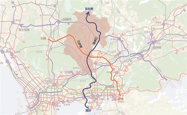 轨道交通25号线:又称为宝龙线,定位为轨道普线,线路起自大浪服装基地,经龙华中心区、华为南区、坂雪岗片区,转向布龙路沿布龙路经布吉上水径至南湾片区,承担大浪、龙华中心和坂雪岗片区对外交通需求,线路过石岩过延长至机场,线路长约36.5公里。本线是支撑深圳市北部发展带的轨道干线,联系石岩、龙华、坂田、布吉等横向二圈层片区,缩短龙华、龙岗、惠州、东莞等至机场的距离,解决原特区外及邻深城市至深圳机场绕行、需多次换乘,便捷性差的问题。■ 记者 周元春