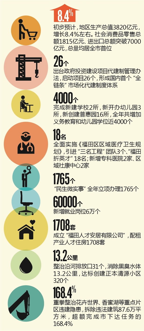 为继续满足市民对更美好生活的需要,福田区将加快补齐民生领域短板。据悉,今年力争增加义务教育学位4200个、幼儿园学位800个;提升住房保障水平,增加人才住房和保障性住房2500套;推广家庭医生“1+N”一站式签约服务模式,大力推广公办养老机构PPP社会化运营模式等等,惠民事项还涉及城区环境、文化服务等,足可期待!